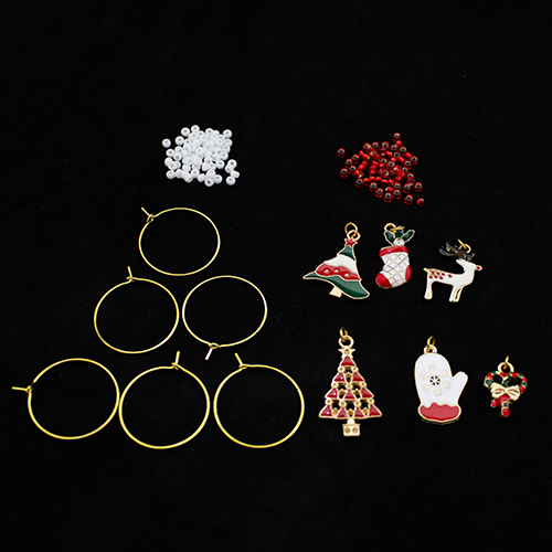 Contents: 6 gold-plated wires, 6 Christmas-themed enamel charms, jump ring already attached to each charm, 1.5g Miyuki Size 8 seed beads in red, 1.5g Miyuki size 8 seed beads in white