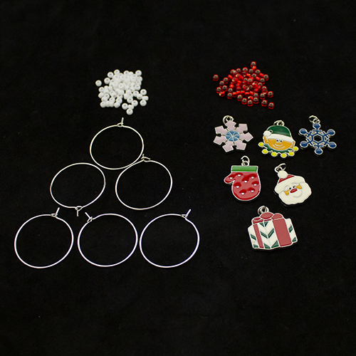 Contents: 6 silver-plated wires, 6 Christmas-themed enamel charms, jump ring already attached to each charm, 1.5g Miyuki Size 8 seed beads in red, 1.5g Miyuki size 8 seed beads in white