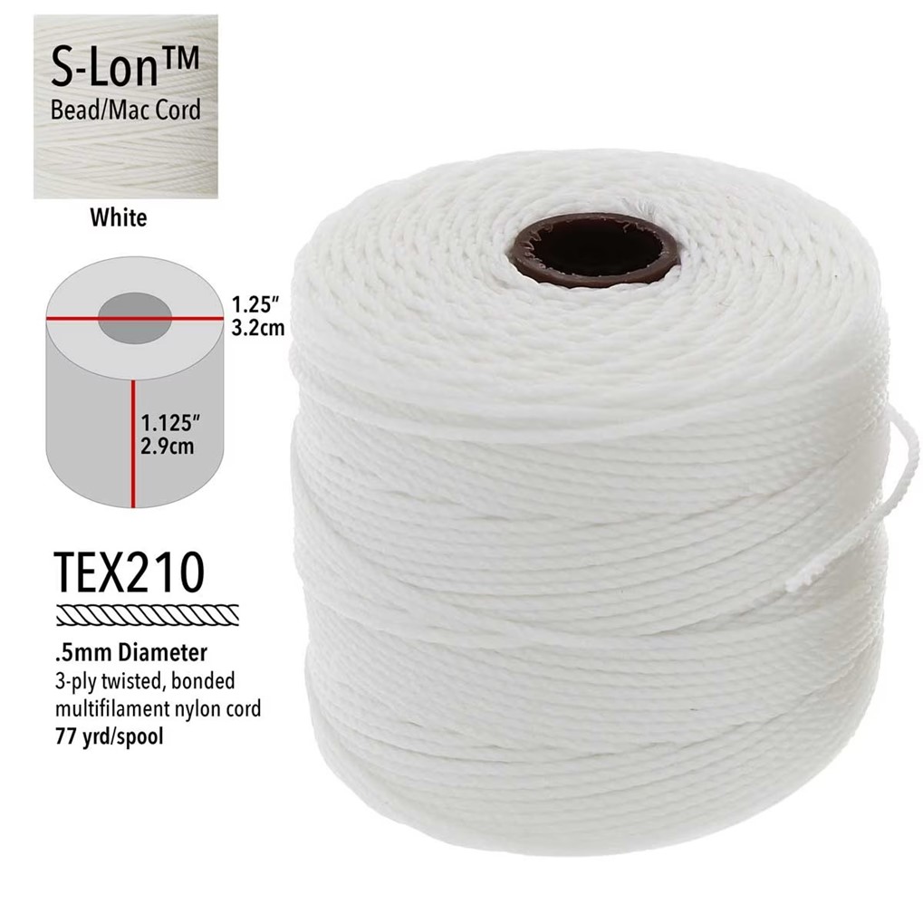 S-Lon Bead Cord (Tex210). 3-ply twisted, bonded multifilament nylon cord. Reel is approx 70 metres (77 yards). Cord diameter 0.5mm.